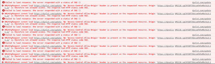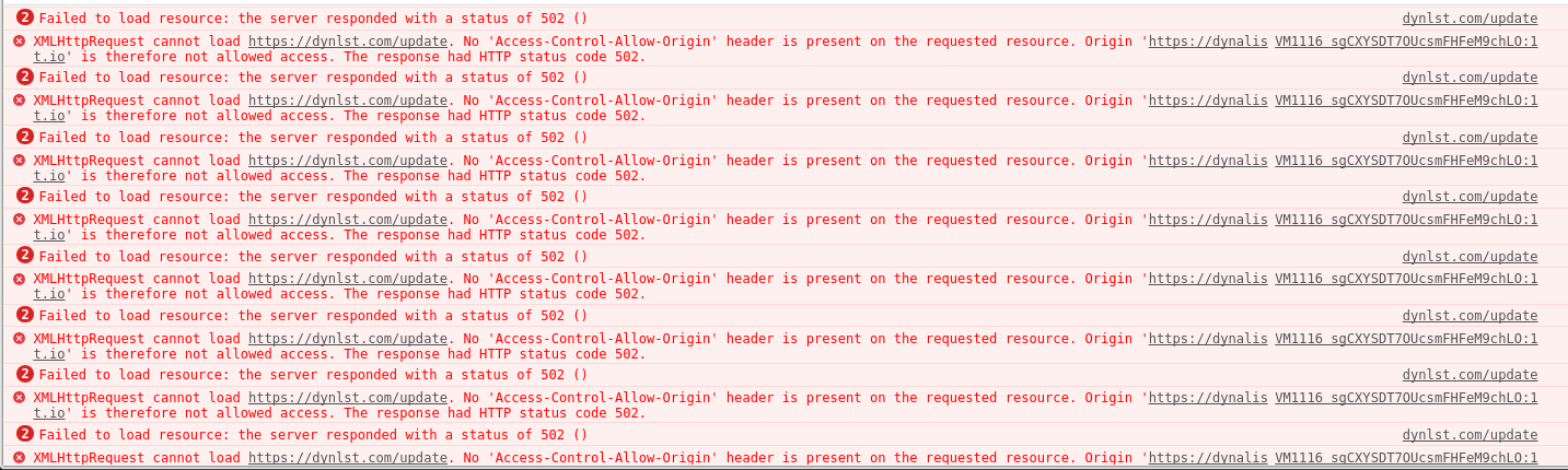 XMLHttpRequest cannot load https://dynlst.com/update. No 'Access-Control-Allow-Origin' header is present on the requested resource. Origin 'https://dynalist.io' is therefore not allowed access. The response had HTTP status code 502.